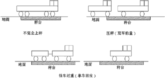 汽車壓在地面是指計量時,司機故意把車停在不正確的位置上,造成計量結(jié)果偏小。多車壓秤指一臺車輛計量時,其它非計量車輛的輪子故意壓在秤上,造成計量結(jié)果偏大。(如圖 2 所示)