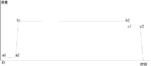 用軟件來解決以上問題,需能找出其中一些共性的規(guī)律。經(jīng)過對汽車衡正常計量情況時的多組數(shù)據(jù)采集、分析,發(fā)現(xiàn)這樣一個規(guī)律(圖 3 表示,該圖是在兩軸汽車的計量過程中得出的,多軸車與此類似):O 到 a1 表示前輪上秤的過程,秤臺的負重變化較大,因此儀表讀數(shù)上升較快;a1 到 a2 表示前輪上秤后,汽車仍在行進,但后輪未上秤,此時秤臺的負重變化不大,所以儀表的讀數(shù)的暫時穩(wěn)定;a2 到 b1 表示后輪上秤的過程,秤臺的負重變化很大,儀表讀數(shù)迅速上升;b1 到 b2 表示前輪,后輪均上秤,儀表讀數(shù)的穩(wěn)定;下秤時與上述的過程相反。a1 到 a2 是前輪單獨在秤臺行進過程時的重量,而 c1 到 c2 表示后輪單獨在秤臺行進過程時的重量,兩者之和大約是 b1 到 b2 區(qū)間的平均重量,即整個車的重量。